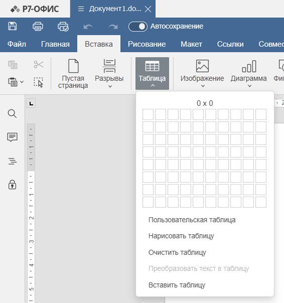 • через меню «Вставка» → «Таблица» (выбор количества строк/столбцов);